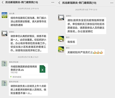 疫情防控期間,公司成立“抗擊新冠肺炎――荊門(mén)建筑院”微信工作群,領(lǐng)導小組及時(shí)傳達市疫情防控指揮部的決策部署和工作要求,定期匯總工作情況和疫情信息。