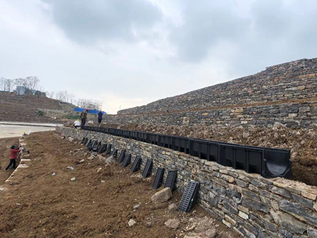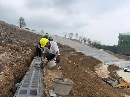 花谷擋墻由一塊一塊的扁平景觀(guān)石砌筑而成,平臺最窄處僅3米多寬,且每級臺階之間垂直落差有1.5米,在陡峭狹長(cháng)的空間上,工人在石料和種植土運輸時(shí)首先將基礎土方開(kāi)挖至臺階狀,再進(jìn)行墻體基礎及砌筑施工。因施工材料無(wú)法直接到達現場(chǎng),施工隊用了10-12臺鏟車(chē)將碎石、混凝土、景觀(guān)片石二次轉運至施工位置;種植土回填則是以大挖機配合小挖機,從上下兩個(gè)方向向中間轉運。