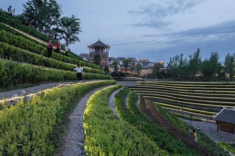 “這些‘梯田’式的臺階叫跌級花谷,原狀是由兩座崗地所夾形成的谷地,山坡坡度40%―60%,我們因形就勢,依托原地形打造出了跌級花谷擋墻。兩側擋墻各有6-8級臺階,總高差約15米?!毙鲁峭顿Y公司現場(chǎng)負責人介紹,此處以鳳冠霞帔為設計理念,由‘從荊山飛來(lái)一只鳳凰,棲息于園博園之中’的故事引申而來(lái),仿造鳳凰的尾羽形態(tài)形成平面布局,呈流線(xiàn)型蜿蜒入內。