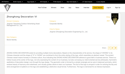 近期,2021年度Muse國際創(chuàng )意獎(Muse Creative Awards)公布獲獎名單,由市城控集團所屬子公司市天城廣告公司副總經(jīng)理孫德華設計的中鴻裝飾(中荊集團全資子公司)VI作品榮獲2021年度Muse國際創(chuàng )意獎金獎。