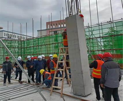 10月18日上午,伴隨著(zhù)重型塔式起重機平穩準確地將項目第一根柱子吊裝入A區二層預留柱子鋼筋上,荊楚理工學(xué)院醫學(xué)教學(xué)實(shí)驗實(shí)訓中心項目裝配式構件吊裝施工正式啟動(dòng),標志著(zhù)項目施工進(jìn)入新階段,距完成節點(diǎn)目標又進(jìn)一步。這既是市城控集團直屬子公司城建集團首個(gè)PC構件裝配式建筑項目,也是荊門(mén)首個(gè)豎向構件框架結構裝配式建筑項目。
