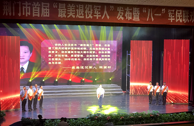 7月29日,“八一”建軍節前夕,荊門(mén)市首屆“最美退役軍人”發(fā)布儀式暨慶“八一”軍民聯(lián)歡演出在荊門(mén)劇院隆重舉行。此次全市“最美退役軍人”評選,經(jīng)網(wǎng)絡(luò )投票、意見(jiàn)征求和綜合審核等環(huán)節層層篩選,最終湖北荊門(mén)建工集團有限公司陳國新等來(lái)自全市各自崗位的20名優(yōu)秀退役軍人脫穎而出榮獲“最美退役軍人”稱(chēng)號。
