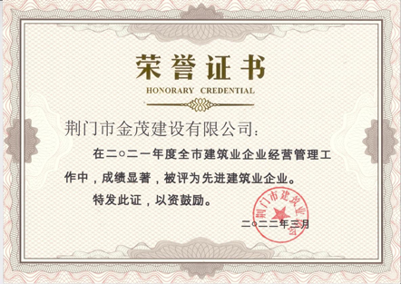 近日,市城控集團所屬子公司金茂公司被荊門(mén)市建筑業(yè)協(xié)會(huì )評為2021年度先進(jìn)建筑業(yè)企業(yè),這是金茂公司自2020年獲此榮譽(yù)后的又一次蟬聯(lián),進(jìn)一步提升了公司在荊門(mén)建筑業(yè)的行業(yè)地位,增強了公司品牌效應。