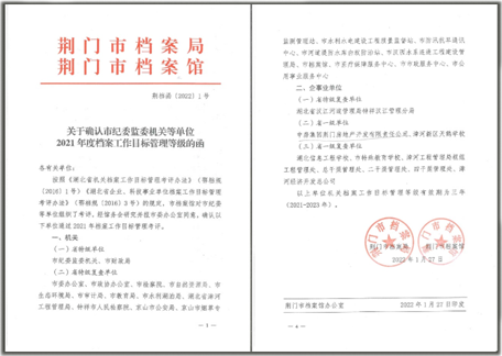 近日,市檔案局、檔案館發(fā)函確認,市城控集團直屬子公司中房集團荊門(mén)公司榮膺“省一級”檔案管理企業(yè),這是按照我省機關(guān)、企業(yè)、科技事業(yè)單位檔案工作目標管理考評辦法規定,由市檔案館組織考評,經(jīng)市委辦公室同意所認定的結果。