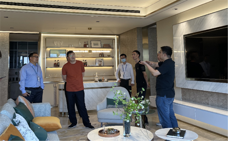 在工作人員引導下,中房集團荊門(mén)公司一行人參觀(guān)了該公司企業(yè)文化長(cháng)廊,“成為客戶(hù)首選、員工自豪、同行尊重、社會(huì )認可的公司”企業(yè)理念,讓參觀(guān)人員印象深刻。在住宅精裝樣板房以及酒店公寓等公共建筑裝修展示區,前衛創(chuàng )新的設計理念,精湛規范的細節工藝和新型材料的積極運用,吸引參觀(guān)人員駐足觀(guān)看品鑒。