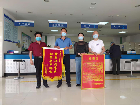 5月15日,金豐公司總經(jīng)理袁家群和東寶區工商聯(lián)相關(guān)負責人來(lái)到市供水總公司,送上感謝信和寫(xiě)有“情系福利事業(yè) 助推金豐騰飛”字樣的鮮艷錦旗。