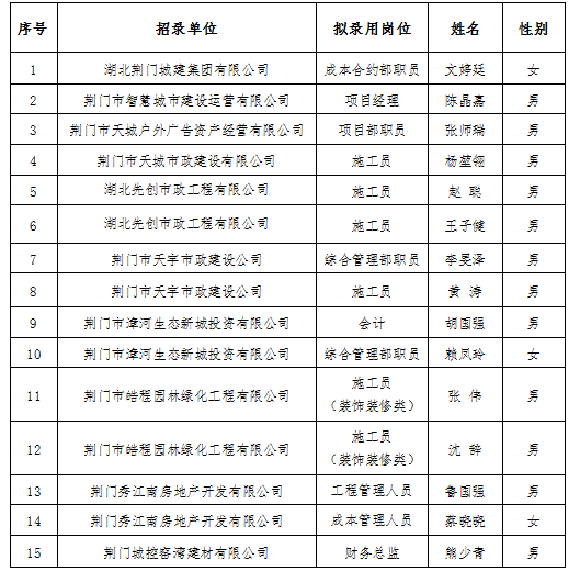 1.湖北先創(chuàng )市政工程有限公司造價(jià)師、荊門(mén)市皓程園林綠化工程有限公司預算員2個(gè)崗位空缺。