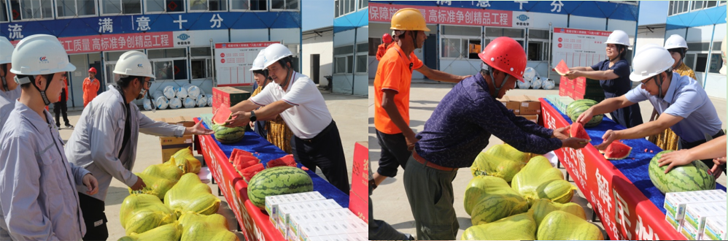 在科創(chuàng )社區項目部,慰問(wèn)組一行詳細了解了一線(xiàn)施工人員的身心狀況、現場(chǎng)防暑降溫措施、工作時(shí)間等情況,并反復叮囑工作一線(xiàn)施工人員要做好自身防護,注意勞逸結合、防暑降溫,要科學(xué)、合理的安排好作息時(shí)間,防止高溫作業(yè)中暑,確保身體健康,防范安全生產(chǎn)事故發(fā)生,并為一線(xiàn)施工人員送去了西瓜、藿香正氣水、礦泉水等防暑降溫慰問(wèn)品。同時(shí),慰問(wèn)組一行來(lái)到項目現場(chǎng),實(shí)地察看科創(chuàng )社區人才服務(wù)中心一期項目建設情況,參觀(guān)了人才公寓、人才住宅公共區域和內部設施。慰問(wèn)組強調,建設人才服務(wù)中心是推動(dòng)我市招才引智、留住高端人才、建設人才高地的重要舉措,是為高端人才、研發(fā)團隊營(yíng)造優(yōu)質(zhì)工作、生活環(huán)境的重要載體,要加快完善相關(guān)配套設施,力爭項目早日落地見(jiàn)效。