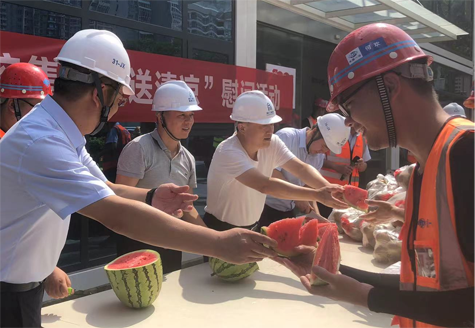 在慰問(wèn)現場(chǎng),張杰為參建人員送上香梨、西瓜、藿香正氣水等防暑慰問(wèn)物資,并與在場(chǎng)人員親切交談,并代表市城控集團黨委感謝大家不畏酷暑,堅守在一線(xiàn)崗位,默默付出,叮囑大家在工作時(shí)務(wù)必注意身體健康和勞動(dòng)安全。同時(shí),他囑咐鑫建公司負責人進(jìn)一步加強夏季人員的勞動(dòng)保護和防暑降溫工作,按照“抓兩頭、歇中間”的原則調整好作業(yè)時(shí)間,控制室外作業(yè)時(shí)間和勞動(dòng)強度,普及好防暑降溫和中暑急救知識,確保勞動(dòng)者的生產(chǎn)生活安全及身體健康。