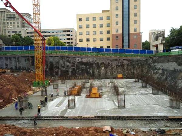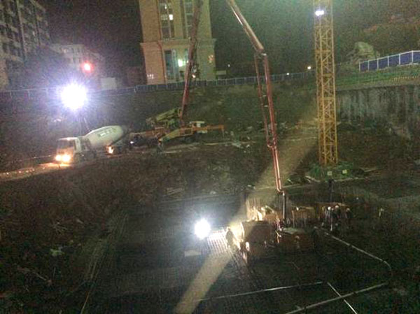 二醫綜合大樓項目地下室基礎底板分A、B、C三部分,其中A區基礎埋置深度最深,施工難度最大,A區底板混凝土澆筑從5月19日19時(shí)正式拉開(kāi)帷幕。為保證大體積混凝土的澆筑質(zhì)量和一次性順利完成,建設、施工、監理等參建各方項目管理人員針對施工場(chǎng)地狹小、工期緊等難題,超前策劃部署,精心制定了澆筑方案。從施工技術(shù)準備、現場(chǎng)準備到質(zhì)量控制、安全措施、勞動(dòng)力組織、交通疏導、交管城管手續等方面作了充分的準備。市康城房地產(chǎn)公司多次組織工程技術(shù)人員和現場(chǎng)施工人員召開(kāi)專(zhuān)項方案會(huì )議,安排交底工作,詳細講解澆筑方案,并進(jìn)行分工責任到人。澆筑現場(chǎng)采用一臺地泵,兩臺天泵輸送,底板混凝土澆筑采取一次性連續澆筑,澆筑采取分層布料,先深后淺,分層間隔,循序漸進(jìn)的方法施工,確保按期完成澆筑施工。