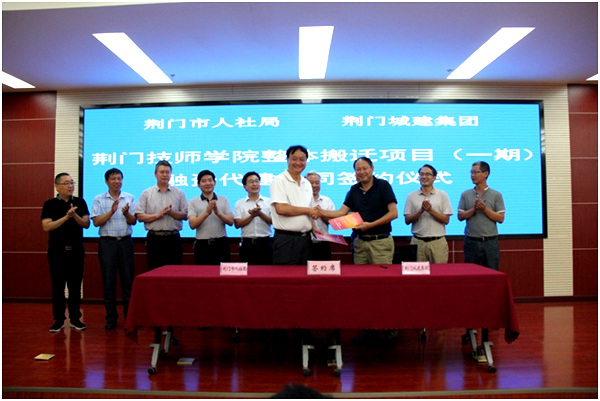 8月28日下午,荊門(mén)技師學(xué)院整體搬遷項目(一期)融資代建合同簽約儀式在市人社局15樓會(huì )議室舉行。市城控集團總經(jīng)理、荊門(mén)城建集團董事長(cháng)豐金亮與市人社局黨組書(shū)記、局長(cháng),市公務(wù)員局局長(cháng)李本全簽署了項目融資代建合同。荊門(mén)技師學(xué)院院長(cháng)許松、黨委書(shū)記陳克新,城建集團副總經(jīng)理葉東、周年昌,荊門(mén)市鑫建城鎮化建設投資有限公司副總經(jīng)理周洪兵等參加并見(jiàn)證了簽約儀式。