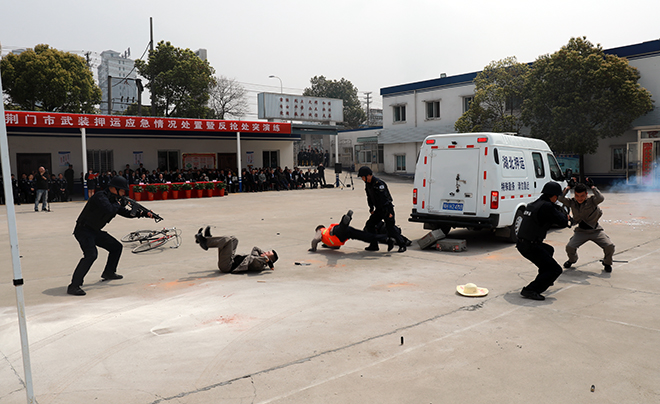 3月29日上午,荊門(mén)市武裝押運應急情況處置暨反搶處突演練在荊門(mén)市金盾保安服務(wù)有限公司舉辦。市公安局、市城控集團、市銀保監分局、中心城區各公安分局、縣(市)公安局保安監管部門(mén)以及全市各商業(yè)銀行安保工作分管負責人等200余人進(jìn)行了現場(chǎng)觀(guān)摩。