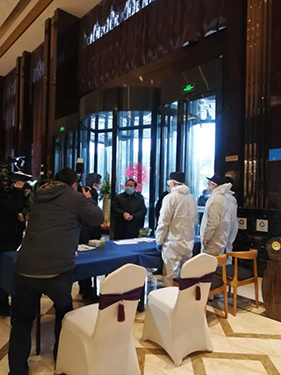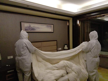 城控凱瑞國際酒店工作人員身著(zhù)防護服,清掃留觀(guān)人員房間