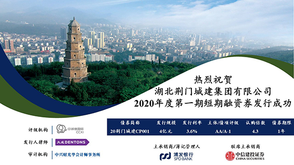 8月20日,市城控集團所屬荊門(mén)城建集團2020年度第一期短期融資券(20荊門(mén)城建CP001)成功發(fā)行,發(fā)行規模4億元,期限1年,票面利率3.6%。該債券為荊門(mén)市非金融企業(yè)成功發(fā)行的首單短期融資券,也是近5年發(fā)行利率首破4%的公開(kāi)市場(chǎng)債券,3.6%的發(fā)行利率創(chuàng )全市近5年來(lái)公開(kāi)發(fā)債市場(chǎng)利率最低。