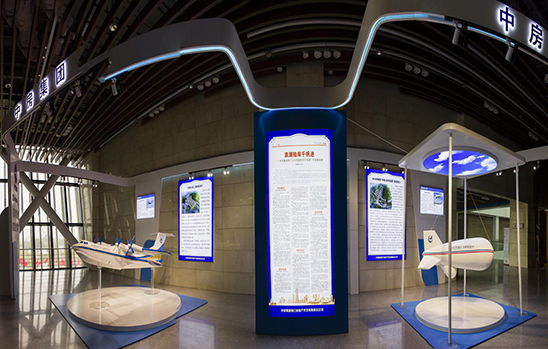 整座展廳占地面積80平方米,高4.2米,設計如鯤鵬展翅外形,映襯以藍天白云,所展示的AG600水陸兩棲飛機模型凌空翱翔,系留氣球平臺浮空萬(wàn)里,視覺(jué)效果極佳。